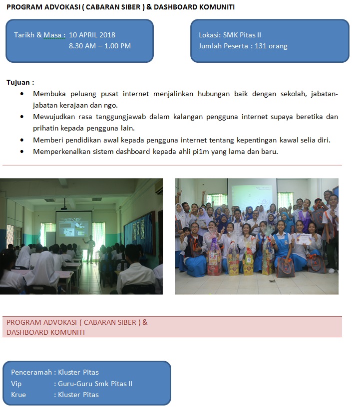 Advokasi KDB & Kelas Masakan Siri 1 (KEMAS) Tarikh : 10 Januari 2019 Masa : 9.00 pagi – 12.00 petang Lokasi : Pusat Internet Kg. Pinggan Pinggan Peserta : 30 orang Tujuan i) Meningkatkan sumber ekonomi keluarga penduduk luar […]