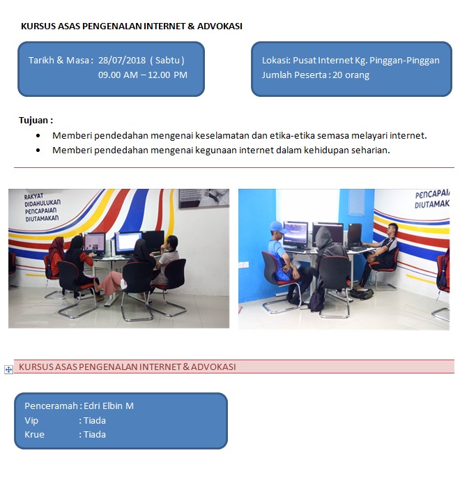 Kelas Latihan Keusahawanan Bersama KEMAS Tarikh : 04 Feb 2019 Masa : 9.00 pagi – 12.00 petang Lokasi : Pusat Internet Kg. Pinggan Pinggan Peserta : 30 orang Tujuan i) Meningkatkan sumber ekonomi keluarga penduduk luar bandar dalam jangka masa […]