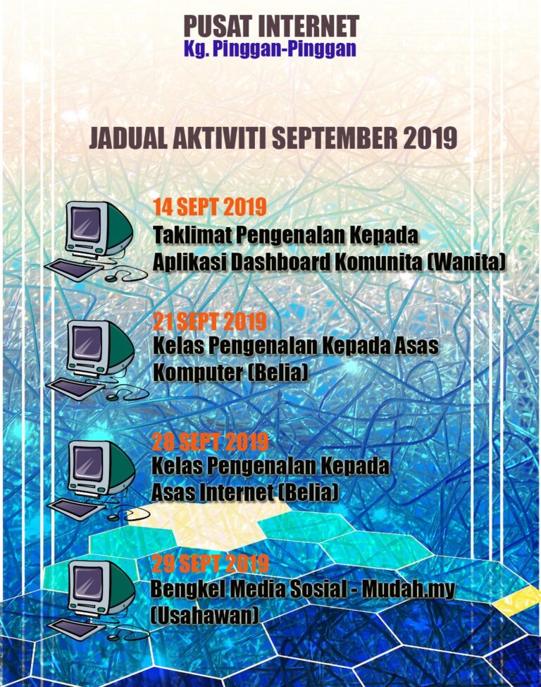 Tarikh : 22 Sept 2019 Masa : 09.00 Pagi – 01.00 Petang Lokasi : Bilik Latihan PI Kg. Pinggan-Pinggan Peserta : 8 Orang Tujuan Memperkenalkan aplikasi Dashboard Komuniti kepada para peserta bagi kegunaan komuniti setempat […]